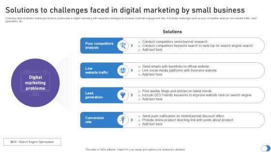 Following slide illustrates challenges faced by businesses in digital marketing with respective strategies to increase customer engagement rate. It includes challenges such as poor competitor analysis, low website traffic, lead generation, etc. Slidegeeks is one of the best resources for PowerPoint templates. You can download easily and regulate Solutions To Challenges Faced In Digital Marketing By Small Business PPT Template SS for your personal presentations from our wonderful collection. A few clicks is all it takes to discover and get the most relevant and appropriate templates. Use our Templates to add a unique zing and appeal to your presentation and meetings. All the slides are easy to edit and you can use them even for advertisement purposes. Following slide illustrates challenges faced by businesses in digital marketing with respective strategies to increase customer engagement rate. It includes challenges such as poor competitor analysis, low website traffic, lead generation, etc.