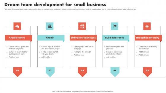This slide showcases dream team building objectives for starting small business. It further includes various objectives such as create culture, find fit, embrace weaknesses, build milestone, etc.Pitch your topic with ease and precision using this Dream Team Development For Small Business Summary Pdf This layout presents information on Embrace Weaknesses, Build Milestones, Strengthen Diversity It is also available for immediate download and adjustment. So, changes can be made in the color, design, graphics or any other component to create a unique layout. This slide showcases dream team building objectives for starting small business. It further includes various objectives such as create culture, find fit, embrace weaknesses, build milestone, etc.