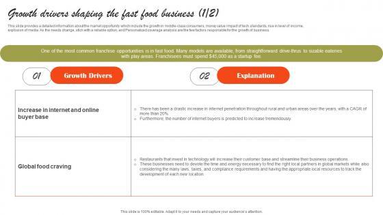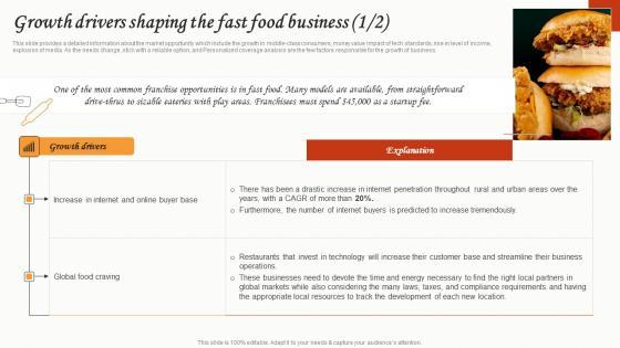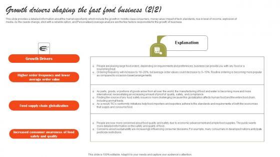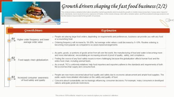 This slide provides a detailed information about the market opportunity which include the growth in middle-class consumers, money value impact of tech standards, rise in level of income, explosion of media. As the needs change, stick with a reliable option, and Personalized coverage analysis are the few factors responsible for the growth of business Here you can discover an assortment of the finest PowerPoint and Google Slides templates. With these templates, you can create presentations for a variety of purposes while simultaneously providing your audience with an eye-catching visual experience. Download Growth Drivers Shaping The Fast Food Business Small Restaurant Business Graphics Pdf to deliver an impeccable presentation. These templates will make your job of preparing presentations much quicker, yet still, maintain a high level of quality. Slidegeeks has experienced researchers who prepare these templates and write high-quality content for you. Later on, you can personalize the content by editing the Growth Drivers Shaping The Fast Food Business Small Restaurant Business Graphics Pdf This slide provides a detailed information about the market opportunity which include the growth in middle-class consumers, money value impact of tech standards, rise in level of income, explosion of media. As the needs change, stick with a reliable option, and Personalized coverage analysis are the few factors responsible for the growth of business