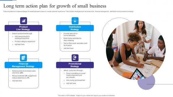 Following slide showcases strategies for small business to improve overall customer experience. This includes strategies such as product line, financial management, distribution and promotional strategy. Pitch your topic with ease and precision using this Long Term Action Plan For Growth Of Small Business Portrait Pdf. This layout presents information on Product Line Strategy, Financial Management Strategy, Promotional Strategy. It is also available for immediate download and adjustment. So, changes can be made in the color, design, graphics or any other component to create a unique layout. Following slide showcases strategies for small business to improve overall customer experience. This includes strategies such as product line, financial management, distribution and promotional strategy.