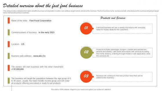 This slide provides a detailed information about the businesss incorporation, location, web-address, target market, and about the business. The food business name, business website, what all places the business will going to target and a brief about businesss summary. This Detailed Overview About The Fast Food Business Small Restaurant Business Structure Pdf is perfect for any presentation, be it in front of clients or colleagues. It is a versatile and stylish solution for organizing your meetings. The Detailed Overview About The Fast Food Business Small Restaurant Business Structure Pdf features a modern design for your presentation meetings. The adjustable and customizable slides provide unlimited possibilities for acing up your presentation. Slidegeeks has done all the homework before launching the product for you. So, do not wait, grab the presentation templates today This slide provides a detailed information about the businesss incorporation, location, web-address, target market, and about the business. The food business name, business website, what all places the business will going to target and a brief about businesss summary.