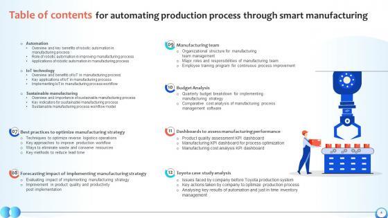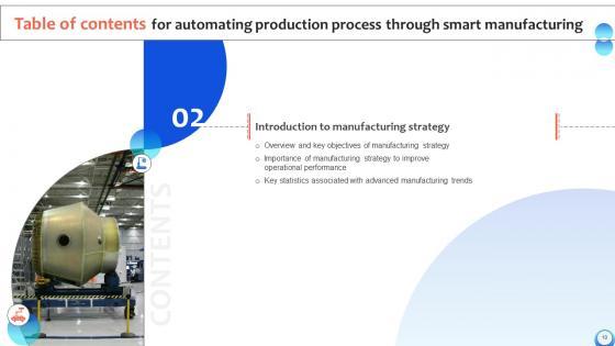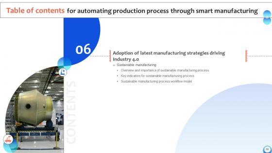This Table Of Contents For Automating Production Process Through Smart Manufacturing Strategy SS V is perfect for any presentation, be it in front of clients or colleagues. It is a versatile and stylish solution for organizing your meetings. The Table Of Contents For Automating Production Process Through Smart Manufacturing Strategy SS V features a modern design for your presentation meetings. The adjustable and customizable slides provide unlimited possibilities for acing up your presentation. Slidegeeks has done all the homework before launching the product for you. So, do not wait, grab the presentation templates today Our Table Of Contents For Automating Production Process Through Smart Manufacturing Strategy SS V are topically designed to provide an attractive backdrop to any subject. Use them to look like a presentation pro.