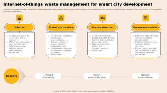 The following slide exhibits the IoT waste management strategy for the development of a smart city by providing real-time data collection on waste. The various components are collection, sorting and recycling, dumping detection, and management analytics. Showcasing this set of slides titled Internet Of Things Waste Management For Smart City Development Sample Pdf. The topics addressed in these templates are Collection, Sorting And Recycling, Dumping Detection. All the content presented in this PPT design is completely editable. Download it and make adjustments in color, background, font etc. as per your unique business setting. The following slide exhibits the IoT waste management strategy for the development of a smart city by providing real-time data collection on waste. The various components are collection, sorting and recycling, dumping detection, and management analytics.