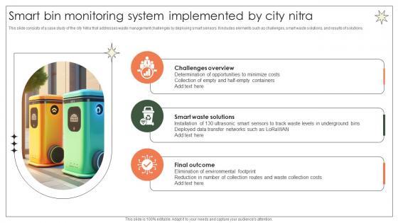 This slide consists of a case study of the city Nitra that addresses waste management challenges by deploying smart sensors. It includes elements such as challenges, smart waste solutions, and results of solutions. Boost your pitch with our creative Smart Bin Monitoring System Implemented By City Nitra Implementation Of E Waste Guidelines. Deliver an awe-inspiring pitch that will mesmerize everyone. Using these presentation templates you will surely catch everyones attention. You can browse the ppts collection on our website. We have researchers who are experts at creating the right content for the templates. So you do not have to invest time in any additional work. Just grab the template now and use them. This slide consists of a case study of the city Nitra that addresses waste management challenges by deploying smart sensors. It includes elements such as challenges, smart waste solutions, and results of solutions.