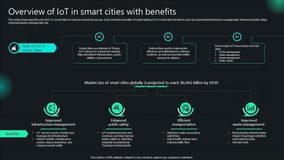 This slide showcases the role of IoT in smart cities to improve overall processes. It also includes benefits of implementing IoT in smart cities functions such as improved infrastructure management, enhanced public safety, improved waste management, etc. If your project calls for a presentation, then Slidegeeks is your go-to partner because we have professionally designed, easy-to-edit templates that are perfect for any presentation. After downloading, you can easily edit Unlocking Potential IoTs Application Overview Of IoT In Smart Cities With Benefits IoT SS V and make the changes accordingly. You can rearrange slides or fill them with different images. Check out all the handy templates This slide showcases the role of IoT in smart cities to improve overall processes. It also includes benefits of implementing IoT in smart cities functions such as improved infrastructure management, enhanced public safety, improved waste management, etc.