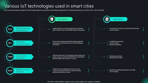 This slide showcases the multiple IoT technologies utilized in smart cities along with their applications. It includes technology such as RFID, NFC, LPWA and WSN. The Unlocking Potential IoTs Application Various IoT Technologies Used In Smart Cities IoT SS V is a compilation of the most recent design trends as a series of slides. It is suitable for any subject or industry presentation, containing attractive visuals and photo spots for businesses to clearly express their messages. This template contains a variety of slides for the user to input data, such as structures to contrast two elements, bullet points, and slides for written information. Slidegeeks is prepared to create an impression. This slide showcases the multiple IoT technologies utilized in smart cities along with their applications. It includes technology such as RFID, NFC, LPWA and WSN.