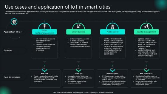 This slide presents the various applications of IoT in intelligent city operations along with their features. It incorporates the application of IoT in smart traffic management, smart parking, public safety, remote monitoring, public transport, utility management, etc. Do you know about Slidesgeeks Use Cases And Application Of IoT In Smart Cities Unlocking Potential IoTs Application IoT SS V These are perfect for delivering any kind od presentation. Using it, create PowerPoint presentations that communicate your ideas and engage audiences. Save time and effort by using our pre-designed presentation templates that are perfect for a wide range of topic. Our vast selection of designs covers a range of styles, from creative to business, and are all highly customizable and easy to edit. Download as a PowerPoint template or use them as Google Slides themes. This slide presents the various applications of IoT in intelligent city operations along with their features. It incorporates the application of IoT in smart traffic management, smart parking, public safety, remote monitoring, public transport, utility management, etc.