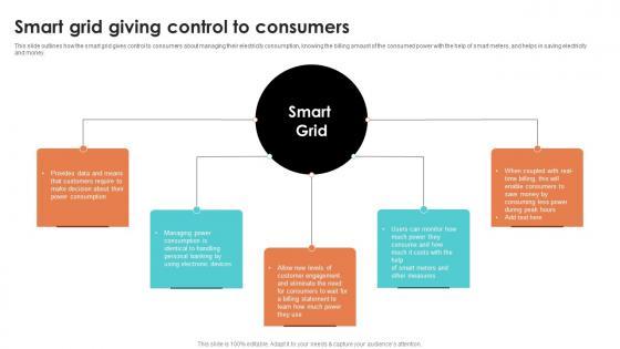 This slide outlines how the smart grid gives control to consumers about managing their electricity consumption, knowing the billing amount of the consumed power with the help of smart meters, and helps in saving electricity and money. Slidegeeks has constructed Smart Grid Giving Control To Consumers Smart Grid Working after conducting extensive research and examination. These presentation templates are constantly being generated and modified based on user preferences and critiques from editors. Here, you will find the most attractive templates for a range of purposes while taking into account ratings and remarks from users regarding the content. This is an excellent jumping off point to explore our content and will give new users an insight into our top notch PowerPoint Templates. This slide outlines how the smart grid gives control to consumers about managing their electricity consumption, knowing the billing amount of the consumed power with the help of smart meters, and helps in saving electricity and money.