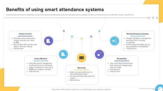Following slide represents key advantage of using automation based attendance systems in education sector. It includes pointers such as fewer errors, cost effective, security, scalability, etc. Do you have to make sure that everyone on your team knows about any specific topic I yes, then you should give Benefits Of Using Smart Attendance Systems Impact Of IoT Technology On Education IoT SS V a try. Our experts have put a lot of knowledge and effort into creating this impeccable Benefits Of Using Smart Attendance Systems Impact Of IoT Technology On Education IoT SS V. You can use this template for your upcoming presentations, as the slides are perfect to represent even the tiniest detail. You can download these templates from the Slidegeeks website and these are easy to edit. So grab these today Following slide represents key advantage of using automation based attendance systems in education sector. It includes pointers such as fewer errors, cost effective, security, scalability, etc.