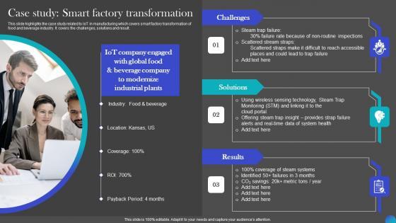 This slide highlights the case study related to IoT in manufacturing which covers smart factory transformation of food and beverage industry. It covers the challenges, solutions and result. This modern and well arranged Iot Applications For Manufacturing Industry Case Study Smart Factory Transformation Download PDF provides lots of creative possibilities. It is very simple to customize and edit with the Powerpoint Software. Just drag and drop your pictures into the shapes. All facets of this template can be edited with Powerpoint no extra software is necessary. Add your own material, put your images in the places assigned for them, adjust the colors, and then you can show your slides to the world, with an animated slide included.