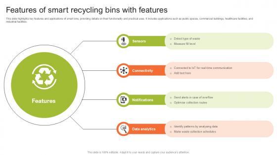This slide highlights key features and applications of smart bins, providing details on their functionality and practical uses. It includes applications such as public spaces, commercial buildings, healthcare facilities, and industrial facilities. Slidegeeks is here to make your presentations a breeze with Features Of Smart Recycling Step By Step Guide For Electronic Ppt Template With our easy-to-use and customizable templates, you can focus on delivering your ideas rather than worrying about formatting. With a variety of designs to choose from, you are sure to find one that suits your needs. And with animations and unique photos, illustrations, and fonts, you can make your presentation pop. So whether you are giving a sales pitch or presenting to the board, make sure to check out Slidegeeks first This slide highlights key features and applications of smart bins, providing details on their functionality and practical uses. It includes applications such as public spaces, commercial buildings, healthcare facilities, and industrial facilities.