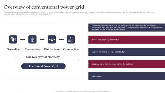 This slide depicts the overview of the conventional power grid, including its block diagram and the process includes power generation, transmission, distribution and consumption. The conventional power grid involves only electricity infrastructure and employs a limited one-way electricity flow. The best PPT templates are a great way to save time, energy, and resources. Slidegeeks have 100 percent editable powerpoint slides making them incredibly versatile. With these quality presentation templates, you can create a captivating and memorable presentation by combining visually appealing slides and effectively communicating your message. Download Smart Grid Technology Phases Of Smart Grid Maturity Model Navigation Template PDF from Slidegeeks and deliver a wonderful presentation.