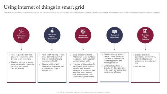 This slide talks about the use cases of IoT in smart grid systems, including connected devices, IoT-based process automation, predictive maintenance, real-time information analytics and visualization, and advanced algorithms. Slidegeeks has constructed Smart Grid Technology Using Internet Of Things In Smart Grid Introduction PDF after conducting extensive research and examination. These presentation templates are constantly being generated and modified based on user preferences and critiques from editors. Here, you will find the most attractive templates for a range of purposes while taking into account ratings and remarks from users regarding the content. This is an excellent jumping off point to explore our content and will give new users an insight into our top notch PowerPoint Templates.