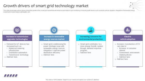 This slide showcases various drivers driving the growth of the smart grid market that will enhance automation in grid monitoring. It include growth drivers such as electric vehicle adoption, integration of renewable energy, investment in transmission optimisation, etc. Make sure to capture your audiences attention in your business displays with our gratis customizable Empowering The Future Growth Drivers Of Smart Grid Technology Market IoT SS V. These are great for business strategies, office conferences, capital raising or task suggestions. If you desire to acquire more customers for your tech business and ensure they stay satisfied, create your own sales presentation with these plain slides. This slide showcases various drivers driving the growth of the smart grid market that will enhance automation in grid monitoring. It include growth drivers such as electric vehicle adoption, integration of renewable energy, investment in transmission optimisation, etc.