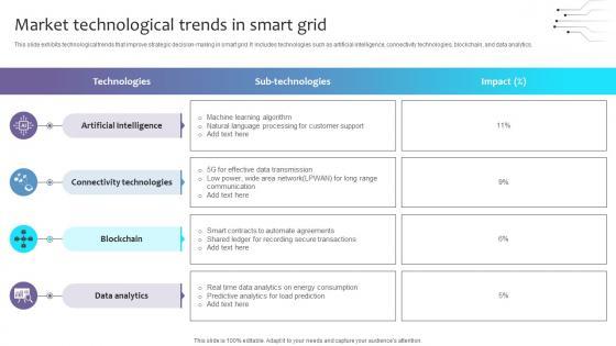 This slide exhibits technological trends that improve strategic decision-making in smart grid. It includes technologies such as artificial intelligence, connectivity technologies, blockchain, and data analytics. Whether you have daily or monthly meetings, a brilliant presentation is necessary. Empowering The Future Market Technological Trends In Smart Grid IoT SS V can be your best option for delivering a presentation. Represent everything in detail using Empowering The Future Market Technological Trends In Smart Grid IoT SS V and make yourself stand out in meetings. The template is versatile and follows a structure that will cater to your requirements. All the templates prepared by Slidegeeks are easy to download and edit. Our research experts have taken care of the corporate themes as well. So, give it a try and see the results. This slide exhibits technological trends that improve strategic decision-making in smart grid. It includes technologies such as artificial intelligence, connectivity technologies, blockchain, and data analytics.