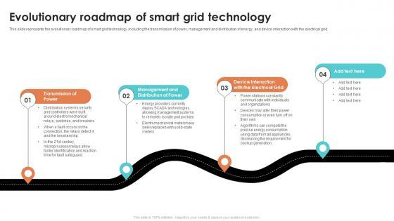 This slide represents the evolutionary roadmap of smart grid technology, including the transmission of power, management and distribution of energy, and device interaction with the electrical grid. Get a simple yet stunning designed Evolutionary Roadmap Of Smart Grid Technology Smart Grid Working It is the best one to establish the tone in your meetings. It is an excellent way to make your presentations highly effective. So, download this PPT today from Slidegeeks and see the positive impacts. Our easy to edit Evolutionary Roadmap Of Smart Grid Technology Smart Grid Working can be your go to option for all upcoming conferences and meetings. So, what are you waiting for Grab this template today. This slide represents the evolutionary roadmap of smart grid technology, including the transmission of power, management and distribution of energy, and device interaction with the electrical grid.