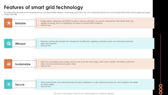 This slide outlines the features of smart grid technology, including reliability, efficiency, sustainability, and security. Also, the smart grid provides two way communication that enables users to supply back surplus energy to the utility. From laying roadmaps to briefing everything in detail, our templates are perfect for you. You can set the stage with your presentation slides. All you have to do is download these easy to edit and customizable templates. Features Of Smart Grid Technology Smart Grid Working will help you deliver an outstanding performance that everyone would remember and praise you for. Do download this presentation today. This slide outlines the features of smart grid technology, including reliability, efficiency, sustainability, and security. Also, the smart grid provides two way communication that enables users to supply back surplus energy to the utility.