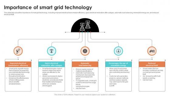 This slide talks about the importance of smart grid technology, including improved electrical transmission efficiency, quick electrical restoration after outages, automatic load balancing, renewable energy use, and reduced electrical theft. Make sure to capture your audiences attention in your business displays with our gratis customizable Smart Grid Technology Importance Of Smart Grid Technology Portrait PDF. These are great for business strategies, office conferences, capital raising or task suggestions. If you desire to acquire more customers for your tech business and ensure they stay satisfied, create your own sales presentation with these plain slides.