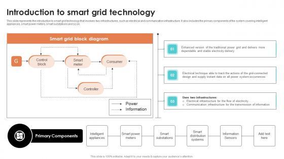 This slide represents the introduction to smart grid technology that involves two infrastructures, such as electrical and communication infrastructure. It also includes the primary components of the system covering intelligent appliances, smart power meters, smart substations and so on. This modern and well arranged Smart Grid Technology Iot Based Electricity Energy Meter Reading Background PDF provides lots of creative possibilities. It is very simple to customize and edit with the Powerpoint Software. Just drag and drop your pictures into the shapes. All facets of this template can be edited with Powerpoint no extra software is necessary. Add your own material, put your images in the places assigned for them, adjust the colors, and then you can show your slides to the world, with an animated slide included.