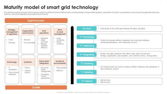 This slide describes the overview of the smart grid maturity model that consists of eight domains, including strategy management and regulatory, organization and structure, grid operations, works and asset management, technology, customer, value chain integration and societal and environmental. Welcome to our selection of the Maturity Model Of Smart Grid Technology Smart Grid Working These are designed to help you showcase your creativity and bring your sphere to life. Planning and Innovation are essential for any business that is just starting out. This collection contains the designs that you need for your everyday presentations. All of our PowerPoints are 100Percent editable, so you can customize them to suit your needs. This multi purpose template can be used in various situations. Grab these presentation templates today. This slide describes the overview of the smart grid maturity model that consists of eight domains, including strategy management and regulatory, organization and structure, grid operations, works and asset management, technology, customer, value chain integration and societal and environmental.