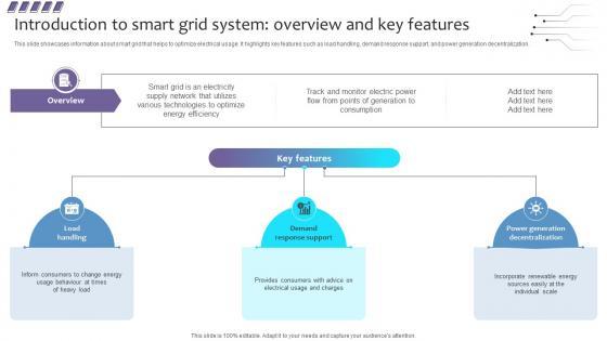 This slide showcases information about smart grid that helps to optimize electrical usage. It highlights key features such as load handling, demand response support, and power generation decentralization. Boost your pitch with our creative A81 Empowering The Future Introduction To Smart Grid System Overview And Key IoT SS V. Deliver an awe-inspiring pitch that will mesmerize everyone. Using these presentation templates you will surely catch everyones attention. You can browse the ppts collection on our website. We have researchers who are experts at creating the right content for the templates. So you do not have to invest time in any additional work. Just grab the template now and use them. This slide showcases information about smart grid that helps to optimize electrical usage. It highlights key features such as load handling, demand response support, and power generation decentralization.