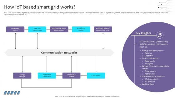 This slide exhibits information about IoT technology that enables efficient transmission of data across the smart grid. It showcases IoT technology role in generation, distribution, and transmission of energy. Create an editable A82 Empowering The Future IoT Based Smart Grid To Enhance Energy Transmission IoT SS V that communicates your idea and engages your audience. Whether you are presenting a business or an educational presentation, pre-designed presentation templates help save time. A82 Empowering The Future IoT Based Smart Grid To Enhance Energy Transmission IoT SS V is highly customizable and very easy to edit, covering many different styles from creative to business presentations. Slidegeeks has creative team members who have crafted amazing templates. So, go and get them without any delay. This slide exhibits information about IoT technology that enables efficient transmission of data across the smart grid. It showcases IoT technology role in generation, distribution, and transmission of energy.