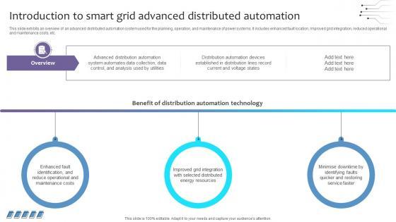 This slide exhibits an overview of an advanced distributed automation system used for the planning, operation, and maintenance of power systems. It includes enhanced fault location, Improved grid integration, reduced operational and maintenance costs, etc. The Empowering The Future Introduction To Smart Grid Advanced Distributed IoT SS V is a compilation of the most recent design trends as a series of slides. It is suitable for any subject or industry presentation, containing attractive visuals and photo spots for businesses to clearly express their messages. This template contains a variety of slides for the user to input data, such as structures to contrast two elements, bullet points, and slides for written information. Slidegeeks is prepared to create an impression. This slide exhibits an overview of an advanced distributed automation system used for the planning, operation, and maintenance of power systems. It includes enhanced fault location, Improved grid integration, reduced operational and maintenance costs, etc.