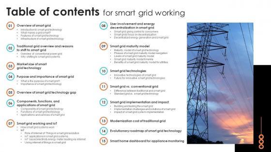 Do you know about Slidesgeeks Table Of Contents For Smart Grid Working These are perfect for delivering any kind od presentation. Using it, create PowerPoint presentations that communicate your ideas and engage audiences. Save time and effort by using our pre designed presentation templates that are perfect for a wide range of topic. Our vast selection of designs covers a range of styles, from creative to business, and are all highly customizable and easy to edit. Download as a PowerPoint template or use them as Google Slides themes. Our Table Of Contents For Smart Grid Working are topically designed to provide an attractive backdrop to any subject. Use them to look like a presentation pro.
