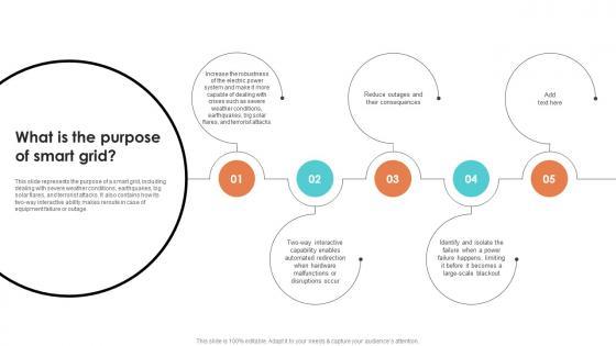 This slide represents the purpose of a smart grid, including dealing with severe weather conditions, earthquakes, big solar flares, and terrorist attacks. It also contains how its two way interactive ability makes reroute in case of equipment failure or outage. Boost your pitch with our creative What Is The Purpose Of Smart Grid Smart Grid Working Deliver an awe inspiring pitch that will mesmerize everyone. Using these presentation templates you will surely catch everyones attention. You can browse the ppts collection on our website. We have researchers who are experts at creating the right content for the templates. So you do not have to invest time in any additional work. Just grab the template now and use them. This slide represents the purpose of a smart grid, including dealing with severe weather conditions, earthquakes, big solar flares, and terrorist attacks. It also contains how its two way interactive ability makes reroute in case of equipment failure or outage.