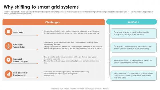 This slide represents the challenges related to the conventional power plant and how smart grid technology can overcome those challenges. The challenges include the use of fossil fuels, one way transmission, frequent power outages, and less consumer participation. Slidegeeks is one of the best resources for PowerPoint templates. You can download easily and regulate Why Shifting To Smart Grid Systems Smart Grid Working for your personal presentations from our wonderful collection. A few clicks is all it takes to discover and get the most relevant and appropriate templates. Use our Templates to add a unique zing and appeal to your presentation and meetings. All the slides are easy to edit and you can use them even for advertisement purposes. This slide represents the challenges related to the conventional power plant and how smart grid technology can overcome those challenges. The challenges include the use of fossil fuels, one way transmission, frequent power outages, and less consumer participation.