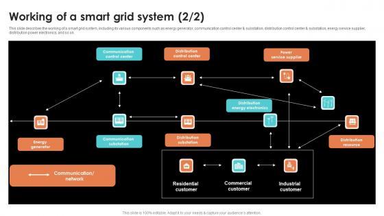 This slide describes the working of a smart grid system, including its various components such as energy generator, communication control center and substation, distribution control center and substation, energy service supplier, distribution power electronics, and so on. Want to ace your presentation in front of a live audience Our Working Of A Smart Grid System Smart Grid Working can help you do that by engaging all the users towards you. Slidegeeks experts have put their efforts and expertise into creating these impeccable powerpoint presentations so that you can communicate your ideas clearly. Moreover, all the templates are customizable, and easy to edit and downloadable. Use these for both personal and commercial use. This slide describes the working of a smart grid system, including its various components such as energy generator, communication control center and substation, distribution control center and substation, energy service supplier, distribution power electronics, and so on.