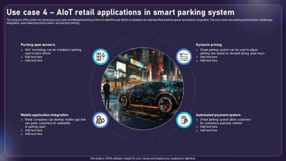 The purpose of this slide is to showcase use cases of intelligent parking system in retail through which companies can optimize their parking space and reduce congestion. The use cases are parking spot sensors, mobile app integration, automated payment system, and dynamic pricing. Find a pre-designed and impeccable Use Case 4 AIOT Retail Applications In Smart Parking System AIOT Applications For Various Industries IoT SS V. The templates can ace your presentation without additional effort. You can download these easy-to-edit presentation templates to make your presentation stand out from others. So, what are you waiting for Download the template from Slidegeeks today and give a unique touch to your presentation. The purpose of this slide is to showcase use cases of intelligent parking system in retail through which companies can optimize their parking space and reduce congestion. The use cases are parking spot sensors, mobile app integration, automated payment system, and dynamic pricing.