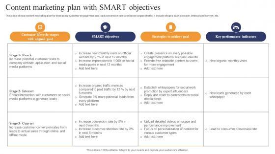 This slide shows content marketing plan for increasing customer engagement and lead conversion rate to enhance organic traffic. It include stages such as reach, interact and convert, etc. Pitch your topic with ease and precision using this Content Marketing Plan With Smart Objectives Diagrams Pdf This layout presents information on Customer Lifecycle, Strategies, Performance Indicators It is also available for immediate download and adjustment. So, changes can be made in the color, design, graphics or any other component to create a unique layout. This slide shows content marketing plan for increasing customer engagement and lead conversion rate to enhance organic traffic. It include stages such as reach, interact and convert, etc.