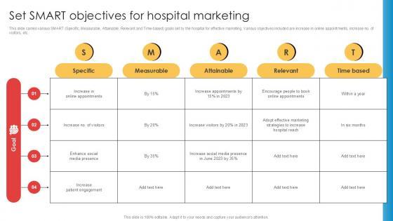 This slide carries various SMART Specific, Measurable, Attainable, Relevant and Time based goals set by the hospital for effective marketing. Various objectives included are increase in online appointments, increase no. of visitors, etc. If you are looking for a format to display your unique thoughts, then the professionally designed Set Smart Objectives For Hospital Marketing Implementation Of Online Ppt Slides is the one for you. You can use it as a Google Slides template or a PowerPoint template. Incorporate impressive visuals, symbols, images, and other charts. Modify or reorganize the text boxes as you desire. Experiment with shade schemes and font pairings. Alter, share or cooperate with other people on your work. Download Set Smart Objectives For Hospital Marketing Implementation Of Online Ppt Slides and find out how to give a successful presentation. Present a perfect display to your team and make your presentation unforgettable. This slide carries various SMART Specific, Measurable, Attainable, Relevant and Time based goals set by the hospital for effective marketing. Various objectives included are increase in online appointments, increase no. of visitors, etc.