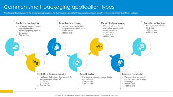 This slide provides an overview of the common packaging applications. Major types covered are freshness, reusable, connected, security self-life extension, tracking and tracing packaging. Welcome to our selection of the Common Smart Packaging Application Types Optimizing Inventory Management IoT SS V. These are designed to help you showcase your creativity and bring your sphere to life. Planning and Innovation are essential for any business that is just starting out. This collection contains the designs that you need for your everyday presentations. All of our PowerPoints are 100Percent editable, so you can customize them to suit your needs. This multi-purpose template can be used in various situations. Grab these presentation templates today. This slide provides an overview of the common packaging applications. Major types covered are freshness, reusable, connected, security self-life extension, tracking and tracing packaging.