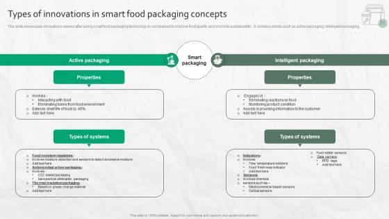 The slide showcases innovations viewed after using smart food packaging technology by companies to improve food quality and promote sustainability . It contains points such as active packaging, intelligent packaging. Are you in need of a template that can accommodate all of your creative concepts This one is crafted professionally and can be altered to fit any style. Use it with Google Slides or PowerPoint. Include striking photographs, symbols, depictions, and other visuals. Fill, move around, or remove text boxes as desired. Test out color palettes and font mixtures. Edit and save your work, or work with colleagues. Download Types Of Innovations In Smart Food Packaging Concepts and observe how to make your presentation outstanding. Give an impeccable presentation to your group and make your presentation unforgettable. The slide showcases innovations viewed after using smart food packaging technology by companies to improve food quality and promote sustainability . It contains points such as active packaging, intelligent packaging.