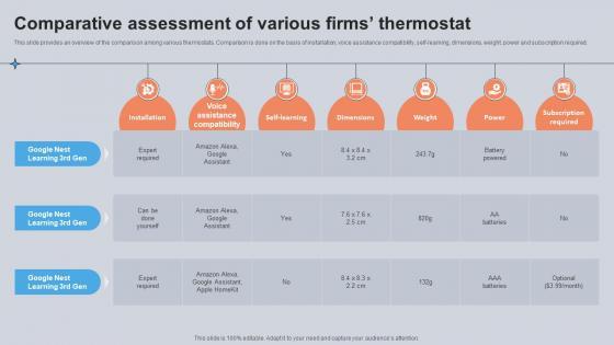 This slide provides an overview of the comparison among various thermostats. Comparison is done on the basis of installation, voice assistance compatibility, self-learning, dimensions, weight, power and subscription required. From laying roadmaps to briefing everything in detail, our templates are perfect for you. You can set the stage with your presentation slides. All you have to do is download these easy-to-edit and customizable templates. Comparative Assessment Of Various Firms Thermostat Utilizing Smart Appliances IoT SS V will help you deliver an outstanding performance that everyone would remember and praise you for. Do download this presentation today. This slide provides an overview of the comparison among various thermostats. Comparison is done on the basis of installation, voice assistance compatibility, self-learning, dimensions, weight, power and subscription required.