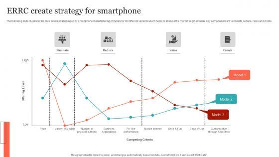 The following slide illustrates the blue ocean strategy used by smartphone manufacturing company for its different variants which helps to analyse the market segmentation. Key components are eliminate, reduce, raise and create. Pitch your topic with ease and precision using this ERRC Create Strategy For Smartphone Background Pdf. This layout presents information on Eliminate, Smartphone, Raise. It is also available for immediate download and adjustment. So, changes can be made in the color, design, graphics or any other component to create a unique layout. The following slide illustrates the blue ocean strategy used by smartphone manufacturing company for its different variants which helps to analyse the market segmentation. Key components are eliminate, reduce, raise and create.
