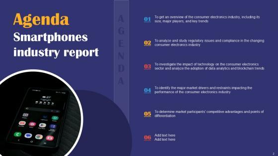 Find a pre designed and impeccable Agenda Smartphones Industry Report PPT PowerPoint IR SS V. The templates can ace your presentation without additional effort. You can download these easy to edit presentation templates to make your presentation stand out from others. So, what are you waiting for Download the template from Slidegeeks today and give a unique touch to your presentation. Our Agenda Smartphones Industry Report PPT PowerPoint IR SS V are topically designed to provide an attractive backdrop to any subject. Use them to look like a presentation pro.