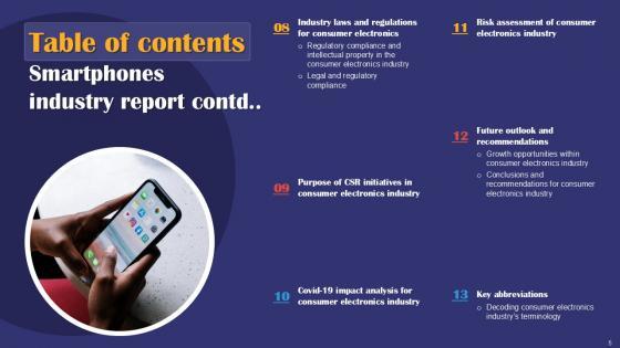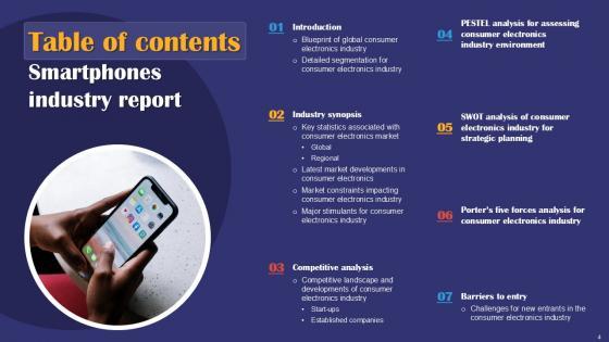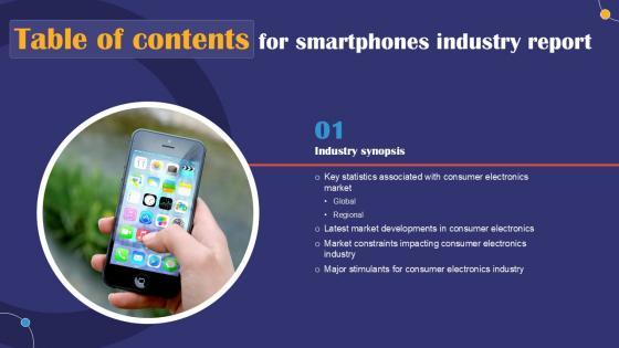 Here you can discover an assortment of the finest PowerPoint and Google Slides templates. With these templates, you can create presentations for a variety of purposes while simultaneously providing your audience with an eye catching visual experience. Download Smartphones Industry Report Table Of Contents PPT PowerPoint IR SS V to deliver an impeccable presentation. These templates will make your job of preparing presentations much quicker, yet still, maintain a high level of quality. Slidegeeks has experienced researchers who prepare these templates and write high quality content for you. Later on, you can personalize the content by editing the Smartphones Industry Report Table Of Contents PPT PowerPoint IR SS V. Our Smartphones Industry Report Table Of Contents PPT PowerPoint IR SS V are topically designed to provide an attractive backdrop to any subject. Use them to look like a presentation pro.