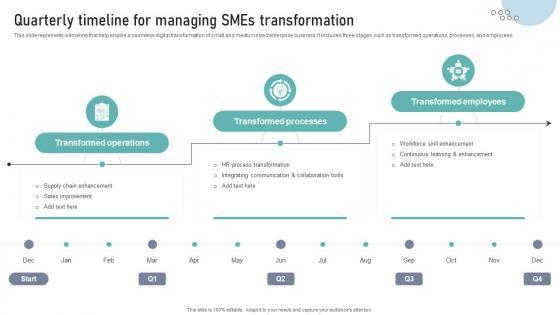This slide represents a timeline that help enable a seamless digital transformation of small and medium sized enterprise business. It includes three stages such as transformed operations, processes, and employees.The Quarterly Timeline For Managing SMEs Transformation DT SS V is a compilation of the most recent design trends as a series of slides. It is suitable for any subject or industry presentation, containing attractive visuals and photo spots for businesses to clearly express their messages. This template contains a variety of slides for the user to input data, such as structures to contrast two elements, bullet points, and slides for written information. Slidegeeks is prepared to create an impression. This slide represents a timeline that help enable a seamless digital transformation of small and medium sized enterprise business. It includes three stages such as transformed operations, processes, and employees.
