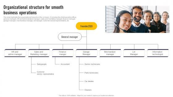 The slide highlights the organizational hierarchy in the company. It includes the chief executing officer, general manager, HR and administration manager, sales and marketing manager, finance manager, garage manager, merchandize manager, lot manager, customer service representative, etc. Find highly impressive Organizational Structure For Smooth Business Operations Auto Dealership Business Plan Information Pdf on Slidegeeks to deliver a meaningful presentation. You can save an ample amount of time using these presentation templates. No need to worry to prepare everything from scratch because Slidegeeks experts have already done a huge research and work for you. You need to download Organizational Structure For Smooth Business Operations Auto Dealership Business Plan Information Pdf for your upcoming presentation. All the presentation templates are 100 percent editable and you can change the color and personalize the content accordingly. Download now. The slide highlights the organizational hierarchy in the company. It includes the chief executing officer, general manager, HR and administration manager, sales and marketing manager, finance manager, garage manager, merchandize manager, lot manager, customer service representative, etc.