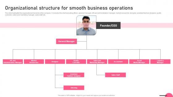 The slide highlights the organizational hierarchy in the company. It includes the chief executing officer, general manager, HR and administration manager, market researcher, designer, assistant fashion designer, quality controller, sales and marketing manager, sales staff, etc. Retrieve professionally designed Organizational Structure For Smooth Business Operations Boutique Business Information Pdf to effectively convey your message and captivate your listeners. Save time by selecting pre-made slideshows that are appropriate for various topics, from business to educational purposes. These themes come in many different styles, from creative to corporate, and all of them are easily adjustable and can be edited quickly. Access them as PowerPoint templates or as Google Slides themes. You do not have to go on a hunt for the perfect presentation because Slidegeeks got you covered from everywhere. The slide highlights the organizational hierarchy in the company. It includes the chief executing officer, general manager, HR and administration manager, market researcher, designer, assistant fashion designer, quality controller, sales and marketing manager, sales staff, etc.