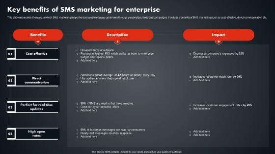 This slide represents the ways in which SMS marketing helps the business to engage customers through personalized texts and campaigns. It includes benefits of SMS marketing such as cost-effective, direct communication etc. Explore a selection of the finest Key Benefits Of SMS Marketing For Enterprise SMS Promotional Tactics Information PDF here. With a plethora of professionally designed and pre-made slide templates, you can quickly and easily find the right one for your upcoming presentation. You can use our Key Benefits Of SMS Marketing For Enterprise SMS Promotional Tactics Information PDF to effectively convey your message to a wider audience. Slidegeeks has done a lot of research before preparing these presentation templates. The content can be personalized and the slides are highly editable. Grab templates today from Slidegeeks. This slide represents the ways in which SMS marketing helps the business to engage customers through personalized texts and campaigns. It includes benefits of SMS marketing such as cost-effective, direct communication etc.