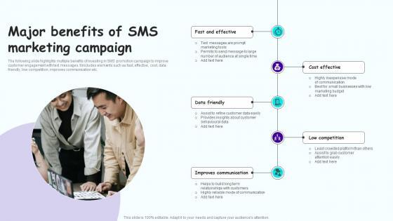 The following slide highlights multiple benefits of investing in SMS promotion campaign to improve customer engagement with text messages. It includes elements such as fast, effective, cost, data friendly, low competition, improves communication etc. If your project calls for a presentation, then Slidegeeks is your go-to partner because we have professionally designed, easy-to-edit templates that are perfect for any presentation. After downloading, you can easily edit Leveraging Mobile Marketing Strategies Major Benefits Of Sms Marketing Campaign Professional Pdf and make the changes accordingly. You can rearrange slides or fill them with different images. Check out all the handy templates The following slide highlights multiple benefits of investing in SMS promotion campaign to improve customer engagement with text messages. It includes elements such as fast, effective, cost, data friendly, low competition, improves communication etc.