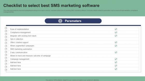 This slide represents the checklist highlighting the things to be kept in mind by marketers at the time of selecting SMS marketing software. It includes details related to parameters such as ease of implementation, compliance management etc. Do you have to make sure that everyone on your team knows about any specific topic I yes, then you should give Checklist To Select Best SMS Marketing Software SMS Promotional Tactics Infographics PDF a try. Our experts have put a lot of knowledge and effort into creating this impeccable Checklist To Select Best SMS Marketing Software SMS Promotional Tactics Infographics PDF. You can use this template for your upcoming presentations, as the slides are perfect to represent even the tiniest detail. You can download these templates from the Slidegeeks website and these are easy to edit. So grab these today This slide represents the checklist highlighting the things to be kept in mind by marketers at the time of selecting SMS marketing software. It includes details related to parameters such as ease of implementation, compliance management etc.
