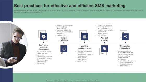 This slide represents the best approaches to be used by marketers in order to boost brand awareness, generate more sales and revenue through SMS marketing. It includes SMS marketing best practices such as add call to action, personalized campaigns etc. Want to ace your presentation in front of a live audience Our Best Practices For Effective And Efficient SMS Text Message Marketing Strategies Guidelines Pdf can help you do that by engaging all the users towards you. Slidegeeks experts have put their efforts and expertise into creating these impeccable powerpoint presentations so that you can communicate your ideas clearly. Moreover, all the templates are customizable, and easy-to-edit and downloadable. Use these for both personal and commercial use. This slide represents the best approaches to be used by marketers in order to boost brand awareness, generate more sales and revenue through SMS marketing. It includes SMS marketing best practices such as add call to action, personalized campaigns etc.