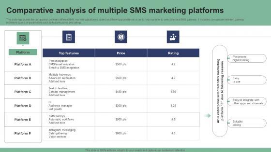 This slide represents the comparison between different SMS marketing platforms based on different parameters in order to help marketer to select the best SMS gateway. It includes comparison between gateway providers based on parameters such as features, price and ratings. Get a simple yet stunning designed Comparative Analysis Of Multiple SMS Marketing Text Message Marketing Strategies Pictures Pdf. It is the best one to establish the tone in your meetings. It is an excellent way to make your presentations highly effective. So, download this PPT today from Slidegeeks and see the positive impacts. Our easy-to-edit Comparative Analysis Of Multiple SMS Marketing Text Message Marketing Strategies Pictures Pdf can be your go-to option for all upcoming conferences and meetings. So, what are you waiting for Grab this template today. This slide represents the comparison between different SMS marketing platforms based on different parameters in order to help marketer to select the best SMS gateway. It includes comparison between gateway providers based on parameters such as features, price and ratings.