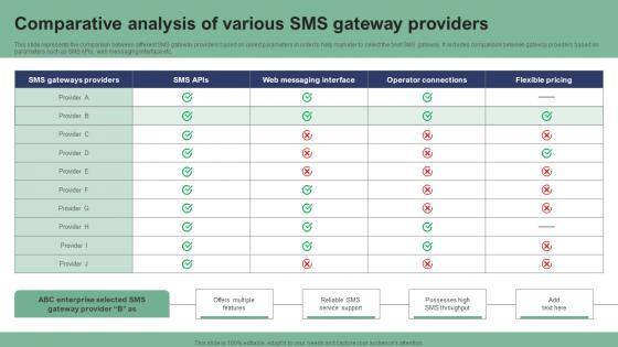 This slide represents the comparison between different SMS gateway providers based on varied parameters in order to help marketer to select the best SMS gateway. It includes comparison between gateway providers based on parameters such as SMS APIs, web messaging interface etc. From laying roadmaps to briefing everything in detail, our templates are perfect for you. You can set the stage with your presentation slides. All you have to do is download these easy-to-edit and customizable templates. Comparative Analysis Of Various SMS Gateway Providers Text Message Marketing Strategies Topics Pdf will help you deliver an outstanding performance that everyone would remember and praise you for. Do download this presentation today. This slide represents the comparison between different SMS gateway providers based on varied parameters in order to help marketer to select the best SMS gateway. It includes comparison between gateway providers based on parameters such as SMS APIs, web messaging interface etc.