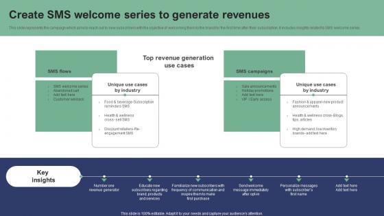 This slide represents the campaign which aims to reach out to new subscribers with the objective of welcoming them to the brand for the first time after their subscription. It includes insights related to SMS welcome series. Present like a pro with Create SMS Welcome Series To Generate Revenues Text Message Marketing Strategies Slides Pdf Create beautiful presentations together with your team, using our easy-to-use presentation slides. Share your ideas in real-time and make changes on the fly by downloading our templates. So whether you are in the office, on the go, or in a remote location, you can stay in sync with your team and present your ideas with confidence. With Slidegeeks presentation got a whole lot easier. Grab these presentations today. This slide represents the campaign which aims to reach out to new subscribers with the objective of welcoming them to the brand for the first time after their subscription. It includes insights related to SMS welcome series.